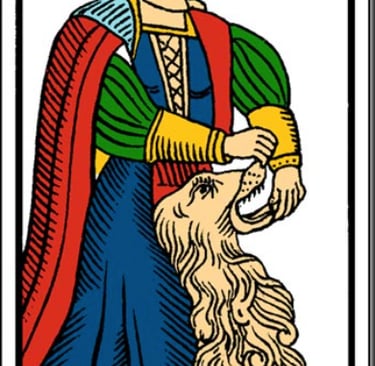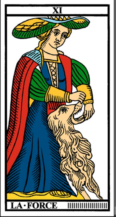 Dans le Tarot, au centre de l’arcane de la force, trône un lion, la gueule tenue ouverte par une femme, sans effort. Ce lion représente ici l’énergie vitale semblant être maîtrisée. D’ailleurs cet arcane est celui des arts martiaux. Il faut une certaine maîtrise pour pouvoir tenir dans sa verticalité. La clef serait-elle d’affronter ses peurs (représentées par le lapin caché dans la crinière du lion.)? Trouver son centre pour pouvoir tenir droit : indépendant et autonome. Le 11 est un chiffre particulier, on dit que c’est un maître nombre, symbolisant entre autre puissance et intuition.